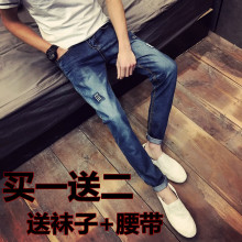 秋冬款韩版直筒弹力破洞牛仔裤男小脚修身型青年潮流显瘦休闲裤子