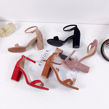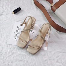 2017新款里外全真皮百搭一字带凉鞋女夏搭扣露趾女鞋中粗跟高跟鞋
