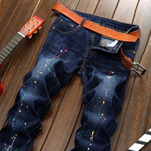 男装日系潮流牛仔裤韩版泼墨修身型弹力小脚显瘦男裤子个性长裤男