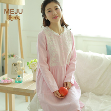 16春夏新款纯棉家居裙蕾丝长袖长款睡裙宽松睡衣纯色纱布家居服女