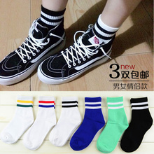 韩国ulzzang条纹二条杠袜子韩版原宿滑板纯棉中筒袜 运动男女短袜