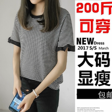 2017荷叶边条纹新款胖妹妹短袖大码夏季宽松半袖显瘦上衣女200斤