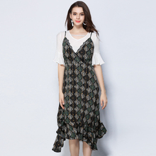 2017春夏胖妹妹碎花连衣裙大码 胖mm短袖吊带连衣裙中长款两件套