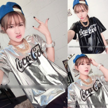 原宿风街头宽松潮牌短袖上衣 女夏银色嘻哈街舞T恤ds爵士舞演出服
