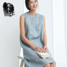 米多立棉麻连衣裙女 2017夏新款女装宽松无袖A字裙亚麻中长款裙子