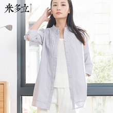 米多立棉麻七分袖衬衫女长袖 春装新款女装立领亚麻中袖衬衣
