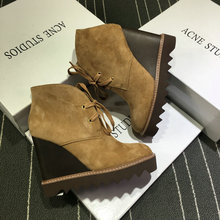 欧洲站2016秋冬女鞋真皮坡跟厚底短靴防水台马丁靴撞色底系带靴