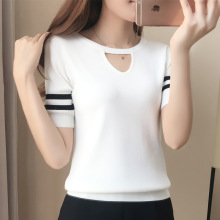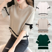 晶鑫悦2017夏装新款冰丝条纹袖针织衫短袖女宽松显瘦百搭打底毛衣