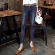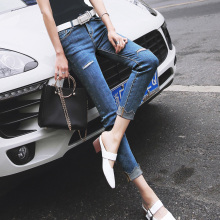 晶鑫悦2017夏季中腰弹力破洞牛仔裤女韩版小脚修身显瘦九分铅笔裤