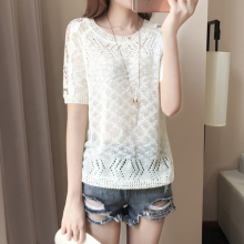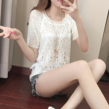 晶鑫悦2017夏季新品韩版短袖宽松蕾丝镂空薄针织衫套头打底罩衫女