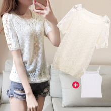 晶鑫悦2017夏季新款韩版圆领蕾丝镂空罩衫女上衣针织套头打底衫潮