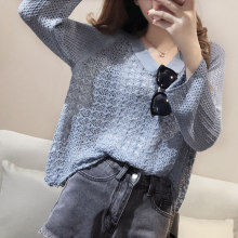 晶鑫悦2016秋季V领套头毛衣女宽松韩版镂空短款长袖针织衫外套