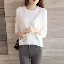 晶鑫悦2016秋季针织衫女套头宽松显瘦镂空长袖圆领冰丝纯色上衣