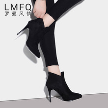 2016冬季新款尖头细跟短靴绒面高跟女靴子加绒性感女鞋短筒及裸靴
