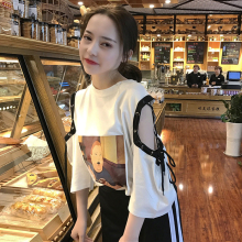 漏肩短袖t恤女夏宽松学生中长袖韩版潮七分袖中长款袖子绑带上衣