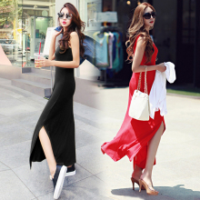 2017夏新款莫代尔连衣裙吊带裙修身包臀打底裙开叉背心长裙一步裙