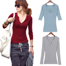2017春夏装新款大码女装纯棉长袖T恤 女士中袖显瘦修身V领打底衫
