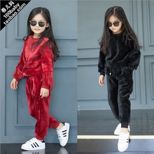2017男女中小童装 纯色金丝天鹅绒长袖加厚加绒卫衣+长裤子 套装
