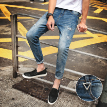 夏季新款韩版青年男士修身弹力小脚裤潮流时尚破洞水洗牛仔九分裤