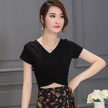 夏季新款性感甜美修身时尚V领交叉短款前后两穿棉质百搭T恤女潮