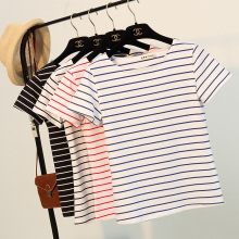 2016夏季新款纯棉宽松短袖条纹女式T恤外穿圆领文艺打底时尚上衣