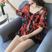 夏季新款韩版大码宽松百搭V领上衣吊带两件套装女短袖碎花雪纺衫