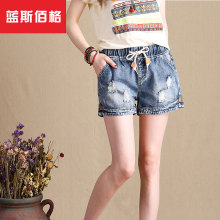 破洞牛仔短裤女夏哈伦裤松紧腰宽松大码显瘦胖mmbf风四分直筒热裤