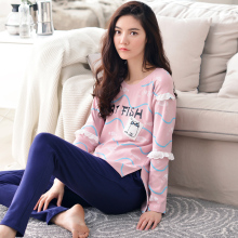 婉若秋水秋冬季长袖纯棉女士睡衣卡通条纹鱼字母全棉女家居服套装