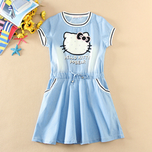 女童短袖连衣裙2017夏装新款 中大童牛仔裙12-15岁纯色公主长裙子