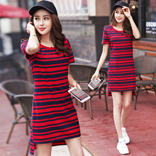 2017夏季韩版新款中长款短袖t恤女装纯棉条纹连衣裙宽松显瘦百搭