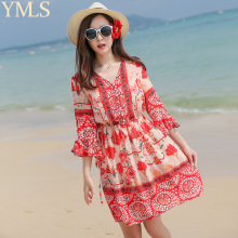 沙滩裙女2017夏季海边度假大码宽松波西米亚显瘦中长款雪纺连衣裙