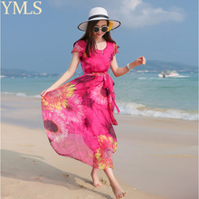 海边度假必备沙滩裙女短袖波西米亚长裙大码显瘦雪纺印花连衣裙夏