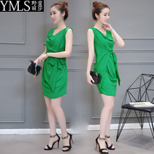 雪纺连衣裙女夏2017新款中长款韩版修身绿色连衣裙无袖V领沙滩裙