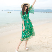 海边度假沙滩裙女五分袖收腰显瘦波西米亚雪纺长裙印花大摆连衣裙