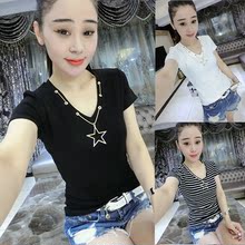 2017新款夏装女装大码修身V领短袖T恤女紧身烫金印花半袖显瘦体恤