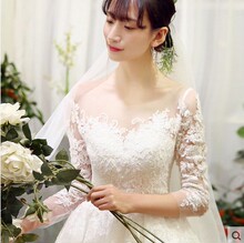 一字肩婚纱礼服齐地韩式双肩2017新款中长袖修身显瘦大码简约春季
