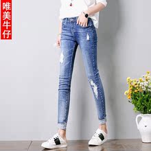 破洞牛仔裤女九分裤夏学生韩版卷边小脚高腰显瘦春季2017新款百搭