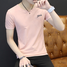男士短袖t恤v领2017新款韩版修身个性潮流男装夏天装粉色简约百搭
