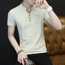 2017新款休闲潮流男士短袖T恤桖v领棉亚麻韩版男装夏简约百搭个性
