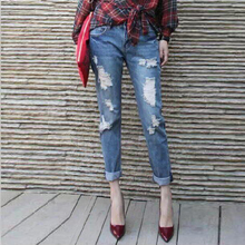 新爆款欧美AA复古工装休闲裤BF风哈伦小脚磨破洞牛仔九分裤女士潮