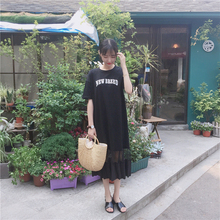 夏季女装韩版宽松网纱拼接中长款短袖T恤上衣过膝连衣裙长裙学生