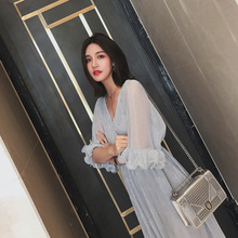 韩版荷叶边V领网纱连衣裙女夏季收腰显瘦木耳边大摆灰蓝色中长裙