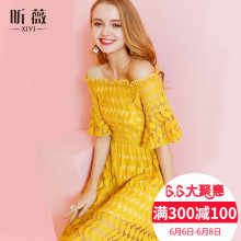 昕薇2017夏装新款修身长裙拼接显瘦露肩喇叭袖一字肩蕾丝连衣裙