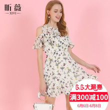 昕薇2017夏装新款荷叶袖短裙拼接显瘦露肩修身碎花雪纺连衣裙女