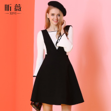 昕薇2016秋装新款黑色背带裙短裙褶皱显瘦休闲a字V领连衣裙女