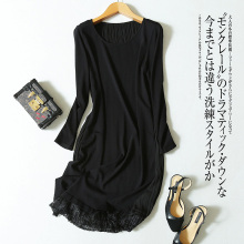韩版雪纺拼接蕾丝百褶打底长裙女黑色波浪纹显瘦针织春款连衣裙薄