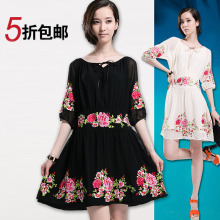 2017春秋款大码女装胖mm显瘦绣花雪纺裙子刺绣中袖民族风连衣裙夏