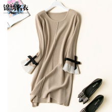 2016韩版女装冰麻针织春秋打底裙圆领荷叶七分袖A字宽松连衣裙春