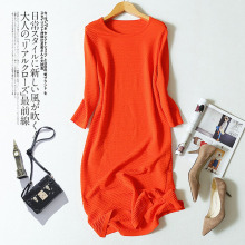 2017春秋新款韩版冰麻针织长裙薄款螺纹圆领七分袖过膝打底连衣裙