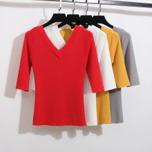 韩版纯色修身显瘦时尚V领针织衫弹力五分中袖套头打底衫上衣女